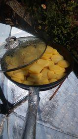 В съвсем малко вода и с малко олио, за да не станат пържени, сол. По 4-5 тигана картофки един след друг, задушени под стъклен капак.