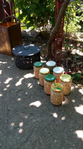 Компот от бяло (булгар) и червено (хамбургски мискет) грозде. На 8 септември 4 тенджери с по 7 буркана, общо 28 буркана изварени до 14,30ч, след което дворът на нашия ентусиаст попада в сянка. Всяка тенджера се изварява ½ ч.